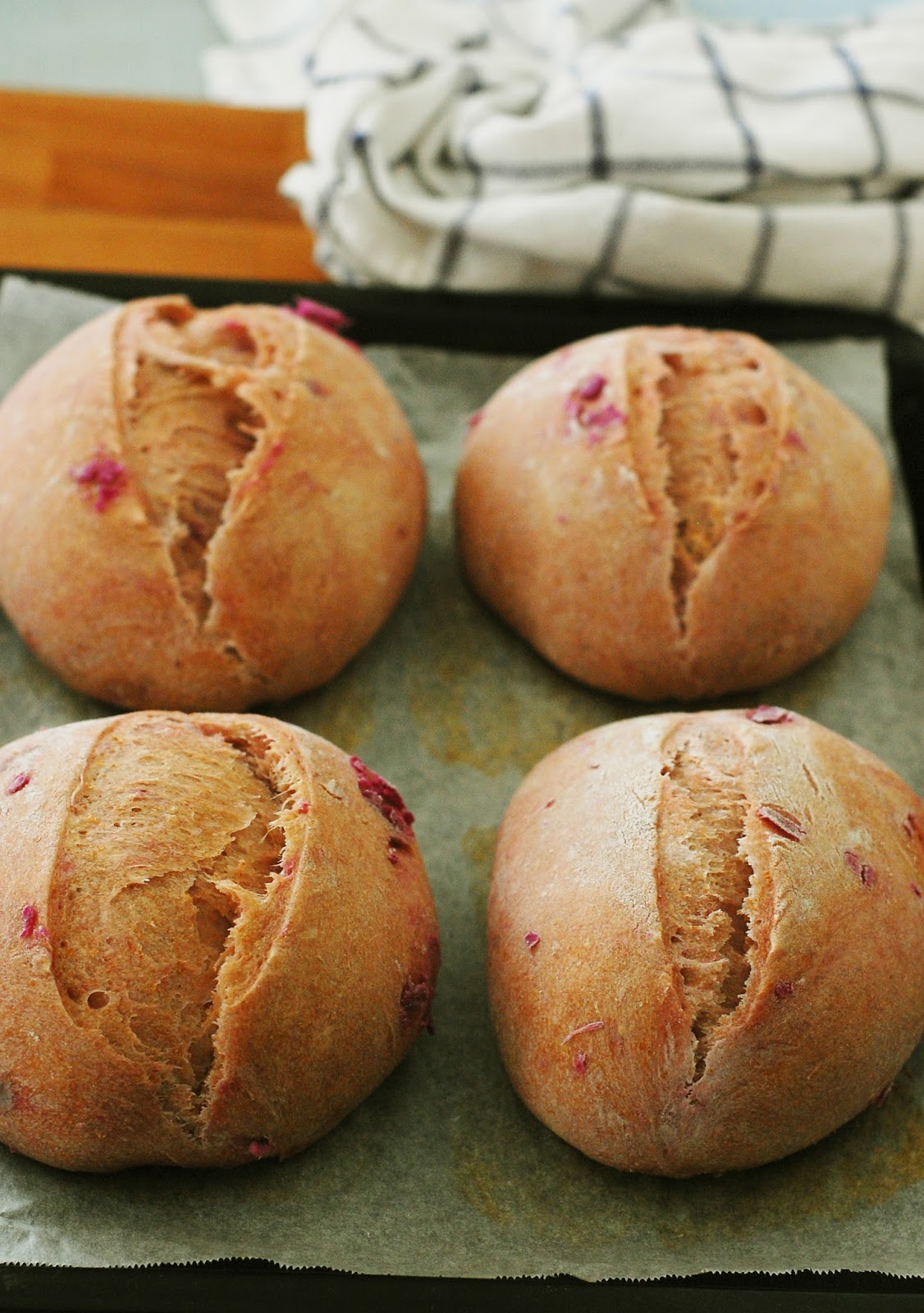 Although the bake wasn't really a successful one (still a little too dense inside, maybe need a longer time to proof), but the colour and outlook still makes me happy. :)